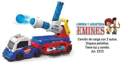 “CAMIÓN DE CARGA CON 2 AUTOS Y DISPARA PELOTITAS TIENE LUZ Y SONIDO MEDIDAS PACKAGING: 28X 54 X 13 CM”