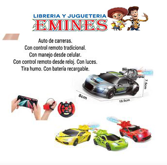 “COCHE DE CARRERAS DE VELOCIDAD CON CONTROL REMOTO TRADICIONAL, CON CONTROL DESDE EL CELULAR Y CONTROL DESDE RELOJ. CON LUCES Y BATERÍA RECARGABLE. TIRA HUMO. MEDIDAS PACKAGING: 12 X 24,5 X 12 CM”