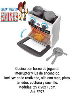 “COCINA CON HORNO DE JUGUETE INTERRUPTOR Y LUZ DE ENCENDIDO. INCLUYE: POLLO ROSTIZADO, OLLA CON TAPA, PLATO, TENEDOR, CUCHARA Y CUCHILLO MEDIDAS PACKAGING 25 X 20 X 13 CM”