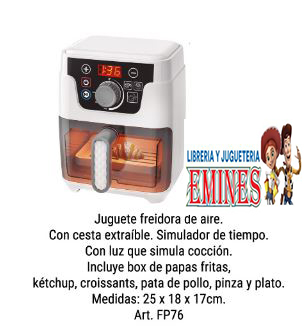 Sé el primero en valorar ““Juguete freidora de aire. Con cesta extraíble. Simular de tiempo Con luz que simula cocción Incluye box de papas fritas, kétchup, Croissants, pata de pollo, pinza y plato. Medidas packaging 25 x 18 x 17 cm”” Cancelar la respuesta