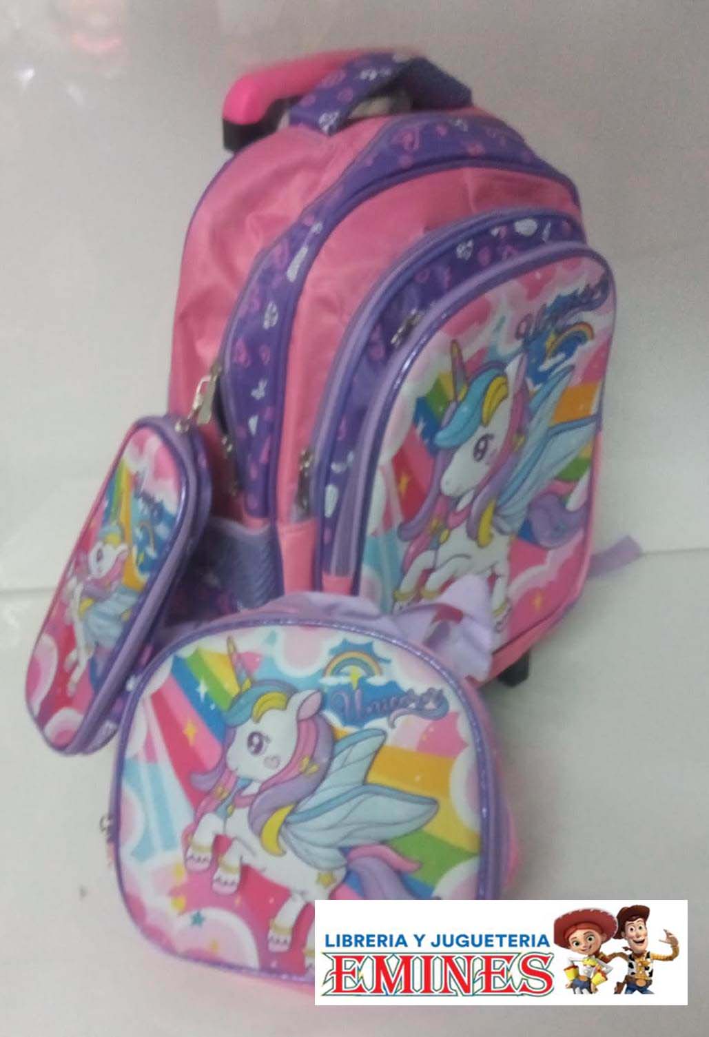 MOCHILA CARRO SET ESCOLAR +LUNCHERA+CANOPLA UNICORNIO