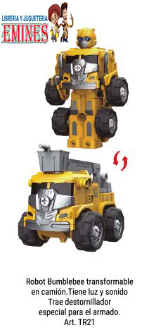 “ROBOT BUMBLEBEE TRANSFORMABLE EN CAMIÓN. TIENE LUZ Y SONIDO TRAE DESTORNILLADOR ESPECIAL PARA EL ARMADO MEDIDAS PACKAGING: 16 X 23,5 X 14,5 CM”
